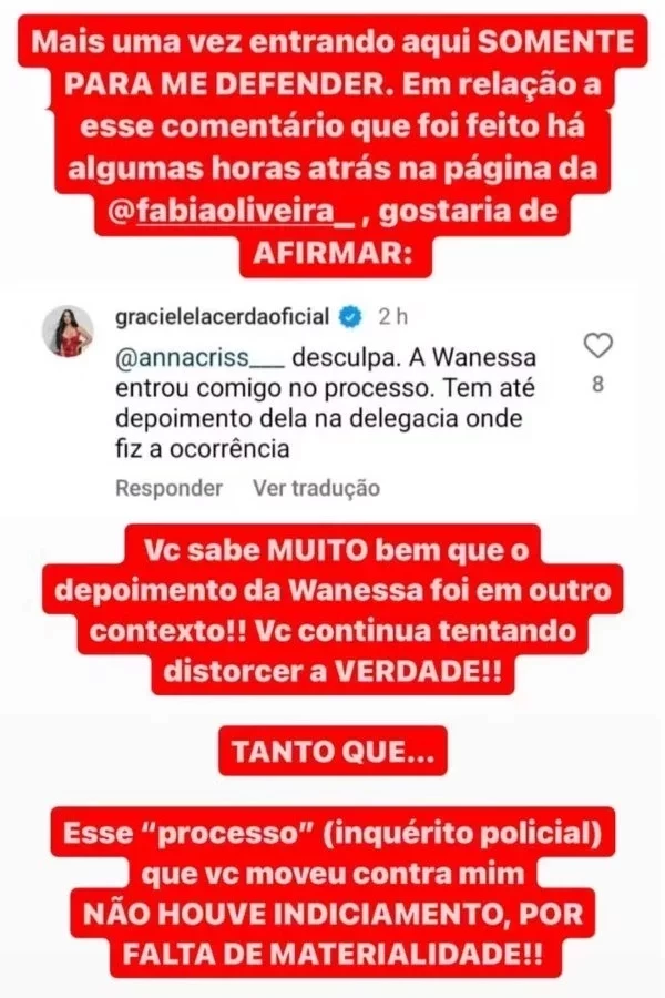Em seguida, Amabylle utilizou seus stories, segundo ela, para se defender e esclarecer a resposta de Graciele. Ela negou que o depoimento da namorada de Dado Dolabella tenha sido no processo em questão e afirmou que a influenciadora tenta distorcer a verdade.