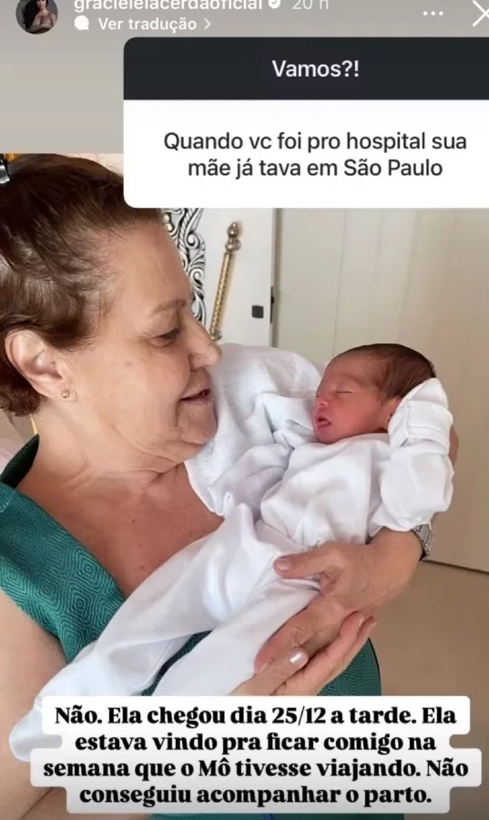 A mãe da modelo chegou à sua casa logo após o nascimento da neta. "Ela chegou dia 25/12. Ela estava vindo para ficar comigo na semana que o Mô estivesse viajando. Não conseguiu acompanhar o parto."