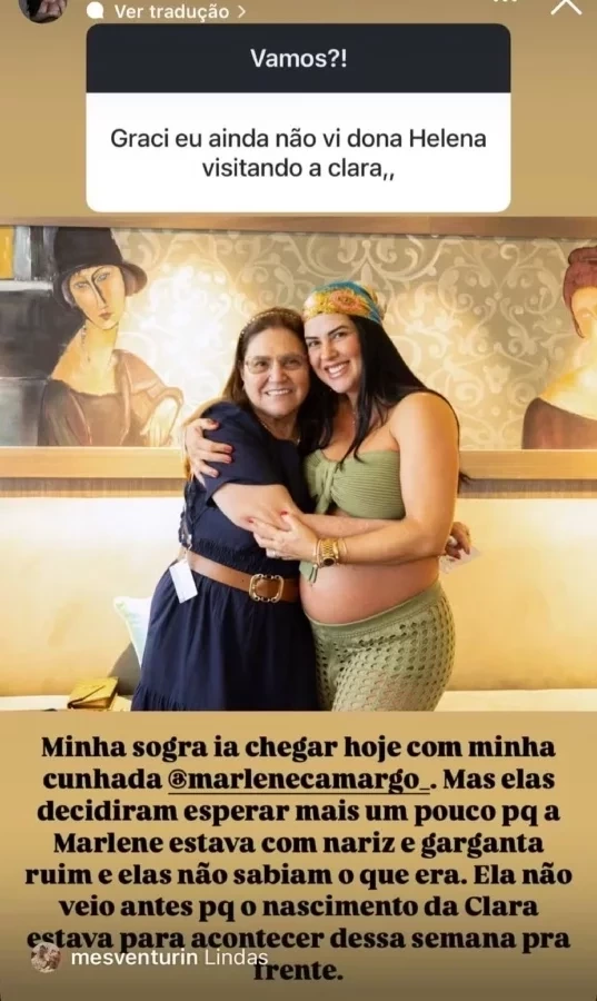 Quanto à sogra, mãe de Zezé, Helena Camargo, deve visitar a criança em breve. "Minha sogra ia chegar hoje com a minha cunhada, mas elas decidiram esperar mais um pouco porque a Marlene estava com nariz e garganta ruins e elas não sabiam o que era. Ela não veio antes, porque o nascimento da Clara estava para acontecer dessa semana para frente", contou.