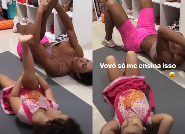Nos vídeos, publicados no Instagram Stories, a garotinha tenta fazer abdominais, mostra elasticidade no alongamento e ainda topa ir para a academia com Gracy que, claro, se divertiu com a brincadeira. "Vovó só me ensina isso", escreveu ela, que realmente tem uma dedicação à malhação inigualável (assista clicando abaixo).