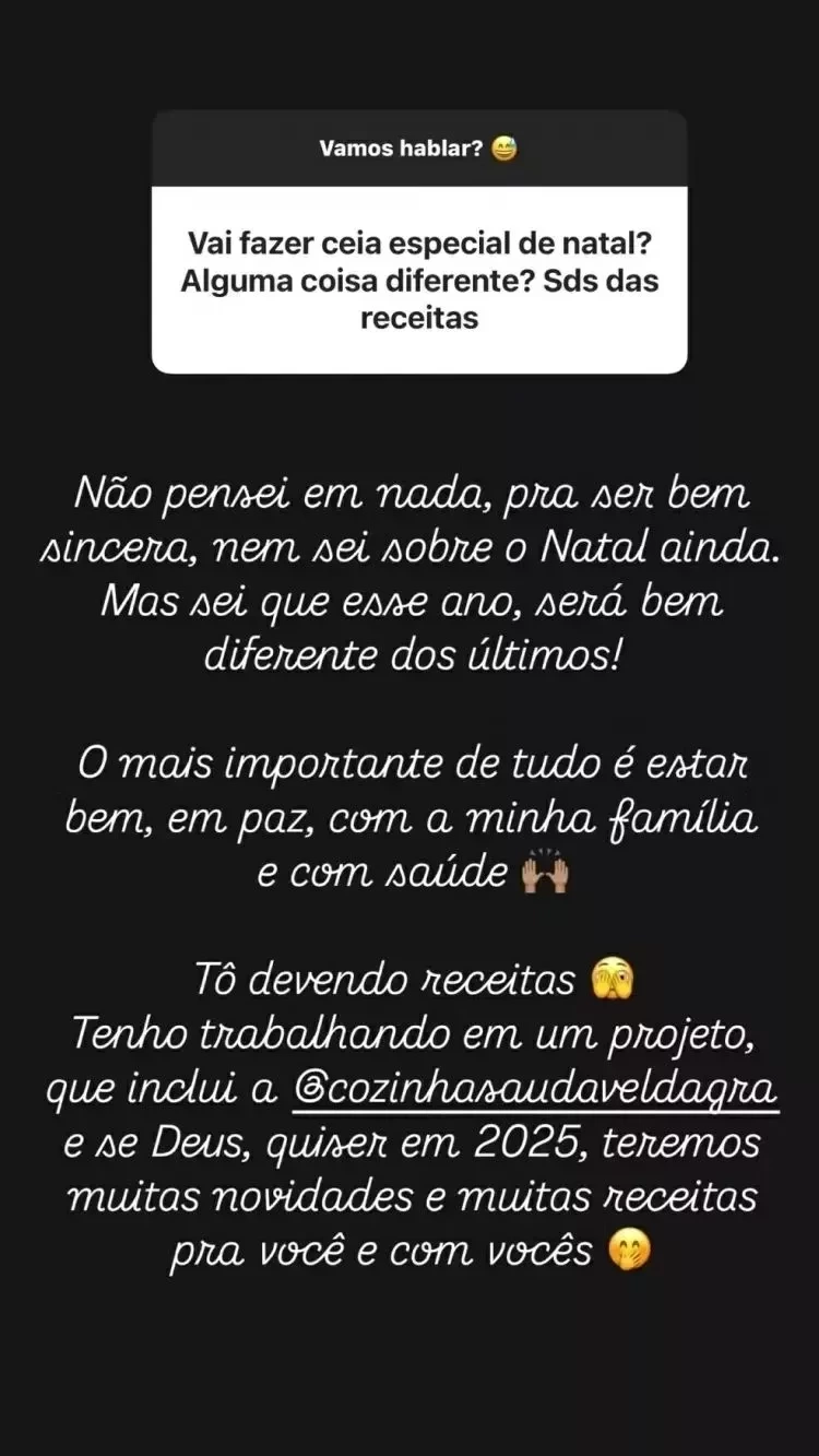 “Não pensei em nada. Para ser bem sincera, nem sei sobre o Natal ainda, mas sei que esse ano será bem diferente dos últimos. O mais importante de tudo é estar bem, em paz, com a minha família e com saúde”, escreveu Gracyanne.