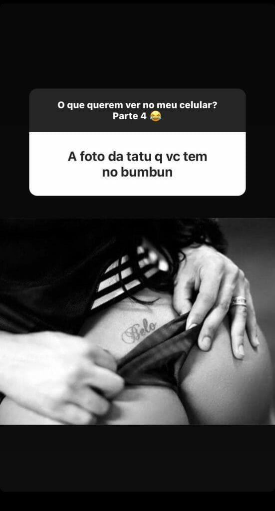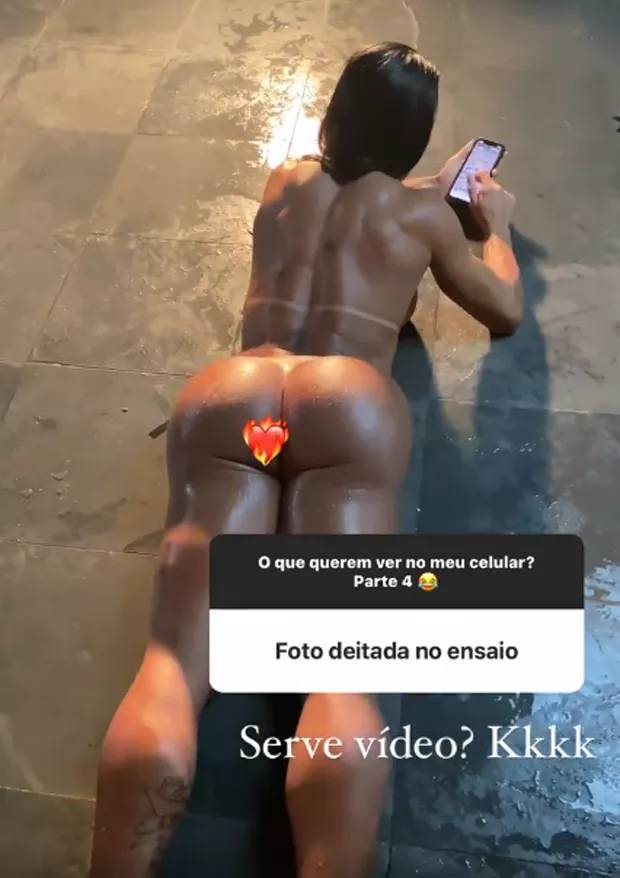 Numa outra ocasião, Gracyanne Barbosa ainda exibiu uma tatuagem íntima que possui estampada com o nome do maridão próximo ao bumbum. No clique, as partes mais íntimas da região quase ficaram totalmente à mostra.
