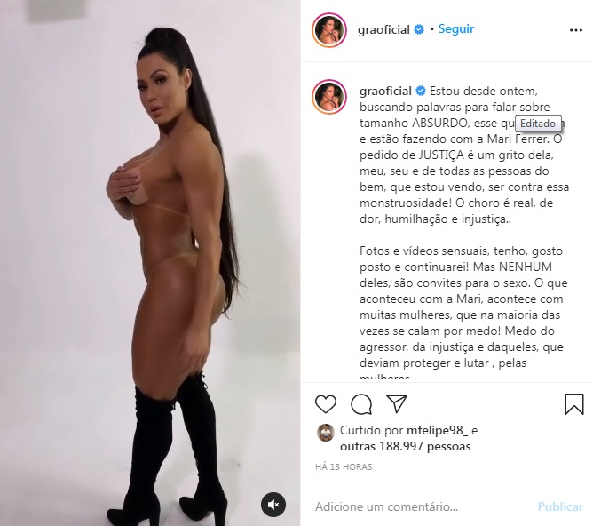 Na postagem, Gracyanne classificou como “absurda” a condução do processo de Mariana Ferrer pela Justiça brasileira e desabafou usando a frase “estupro culposo não existe”.