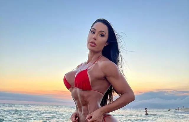 Para as fotos, a esposa de Belo escolheu um look beachwear, composto por um lenço trançado e biquíni fio dental. A vestimenta deixou o seu corpo torneado em evidência.