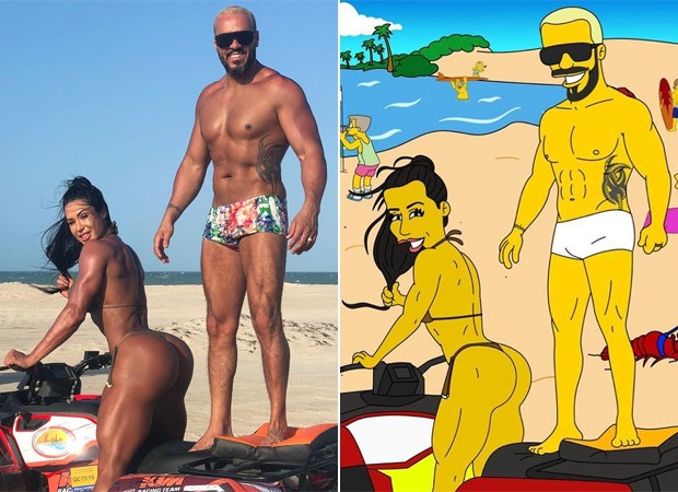 Gracyanne Barbosa e Belo viraram personagens da série de animação icônica Os Simpsons. Um perfil no Instagram chamado Vire Um Simpson reproduziu uma foto em que o casal aparece em viagem pelo nordeste, fazendo passeio de quadriciclo. As informações são da Revista Quem.