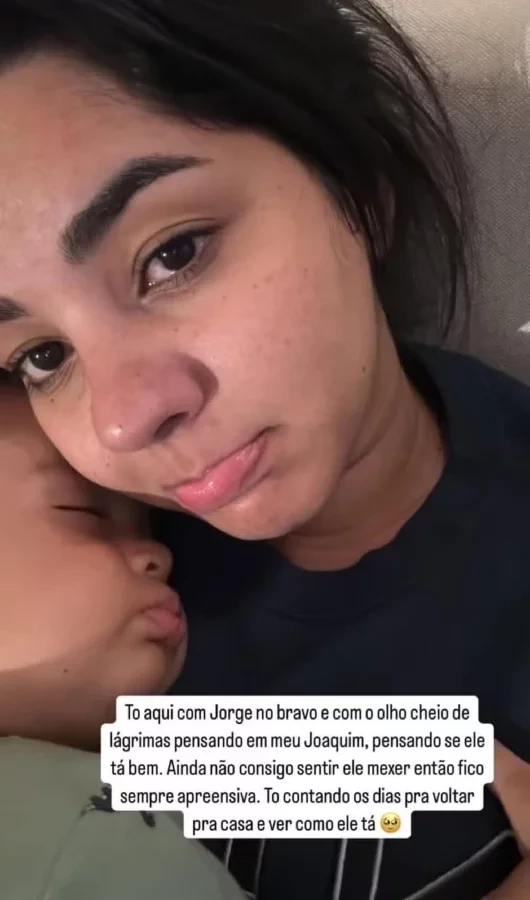 "Estou aqui com Jorge no braço e com o olho cheio de lágrimas, pensando no meu Joaquim, pensando se ele está bem. Ainda não consigo sentir ele se mexer, então fico sempre apreensiva. Estou contando os dias para voltar para casa e ver como ele está", revelou ela.
