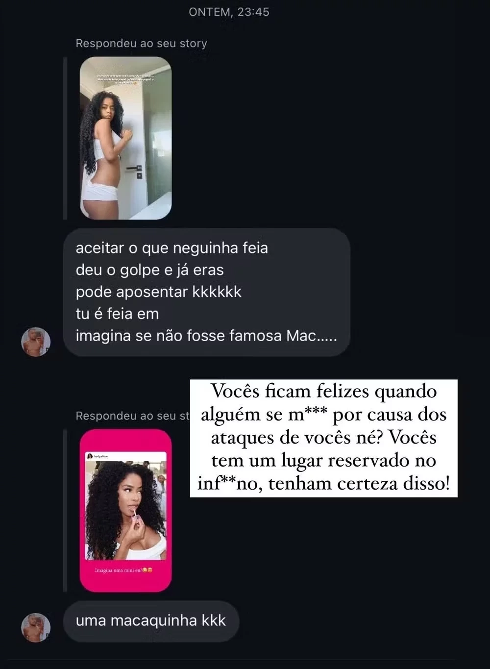 Em uma das mensagens recebidas, um usuário escreveu: “Aceitar o que, neguinha feia, deu o golpe e já era, pode aposentar kkk Tu é feia hein, imagina se não fosse famosa, mac... uma macaquinha kkkk”. Lorena, visivelmente indignada, respondeu: “Vocês ficam felizes quando alguém se mata por causa dos ataques de vocês, né? Vocês têm lugar reservado no inferno, tenham certeza disso!”