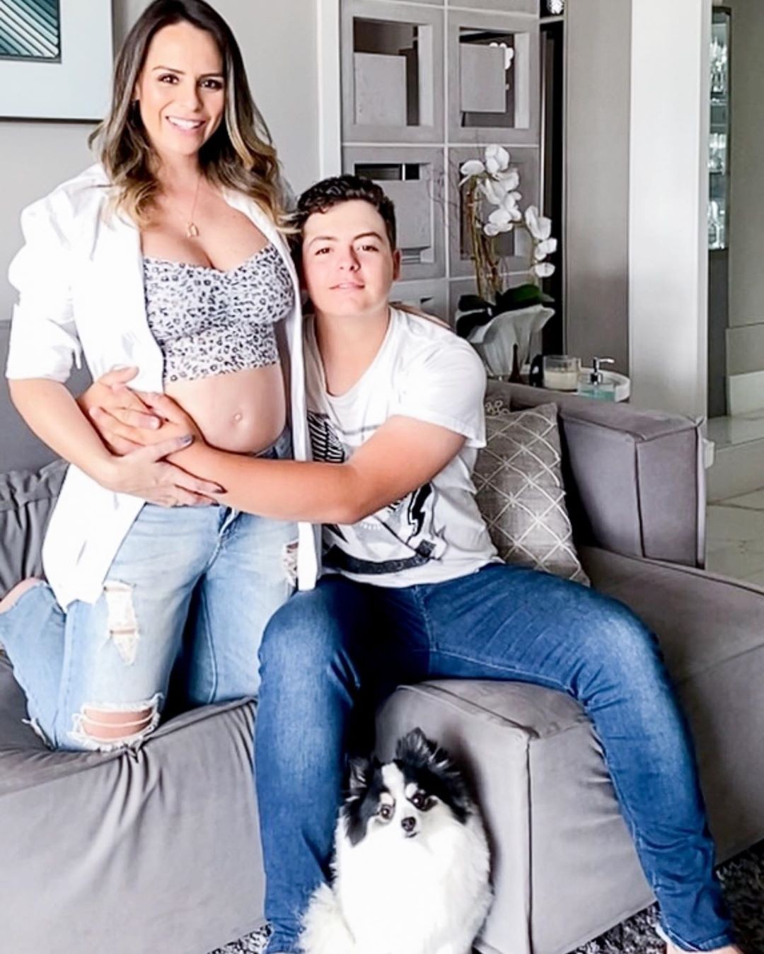 "Ah já que hoje é dia dos filhos vou aproveitar!!! Todos os meus em um momento especial!! @netoduchi Te amo demais!!!! Jajá vamos ter que atualizar essa foto!", postou Aline, que é casada com o jogador de futebol Rafael Longuine. "Te amooo", respondeu Neto no post em que aparece abraçando a mamãe com o barrigão à mostra.