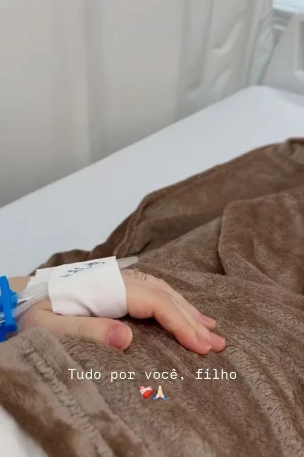 Em uma foto emocionante, ela mostrou sua mão em cima da barriga, já com os acessos necessários para o tratamento. "Tudo por você, filho", disse ela.
