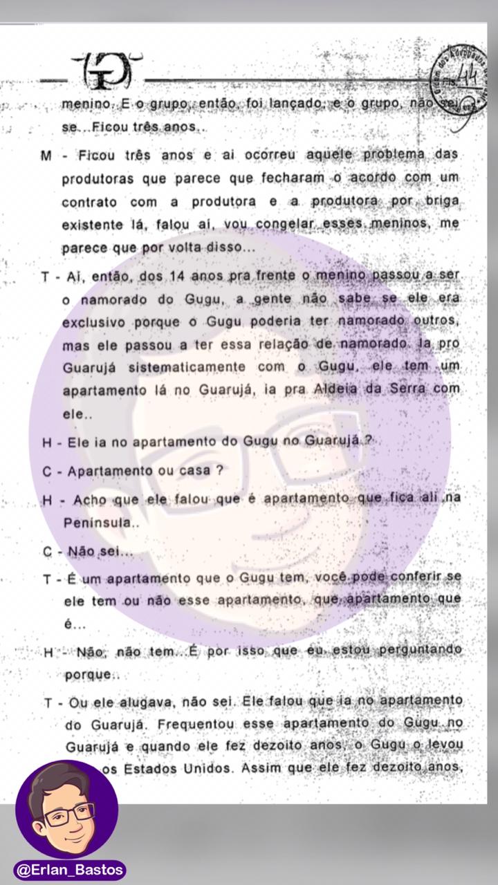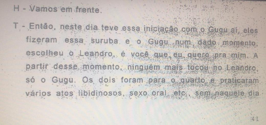 O jornalista Erlan Bastos destacou que no processo, que dispõe de mais de mil páginas, consta que Leandro começou a se relacionar com Gugu aos 14 anos e foi até os 23 anos.  No processo continha e-mails com conversas entre os dois, com desabafos e conversas intimas entre Gugu e Leandro. O processo cita ainda Marcelo Augusto, apontado como suposto namorado de Gugu.