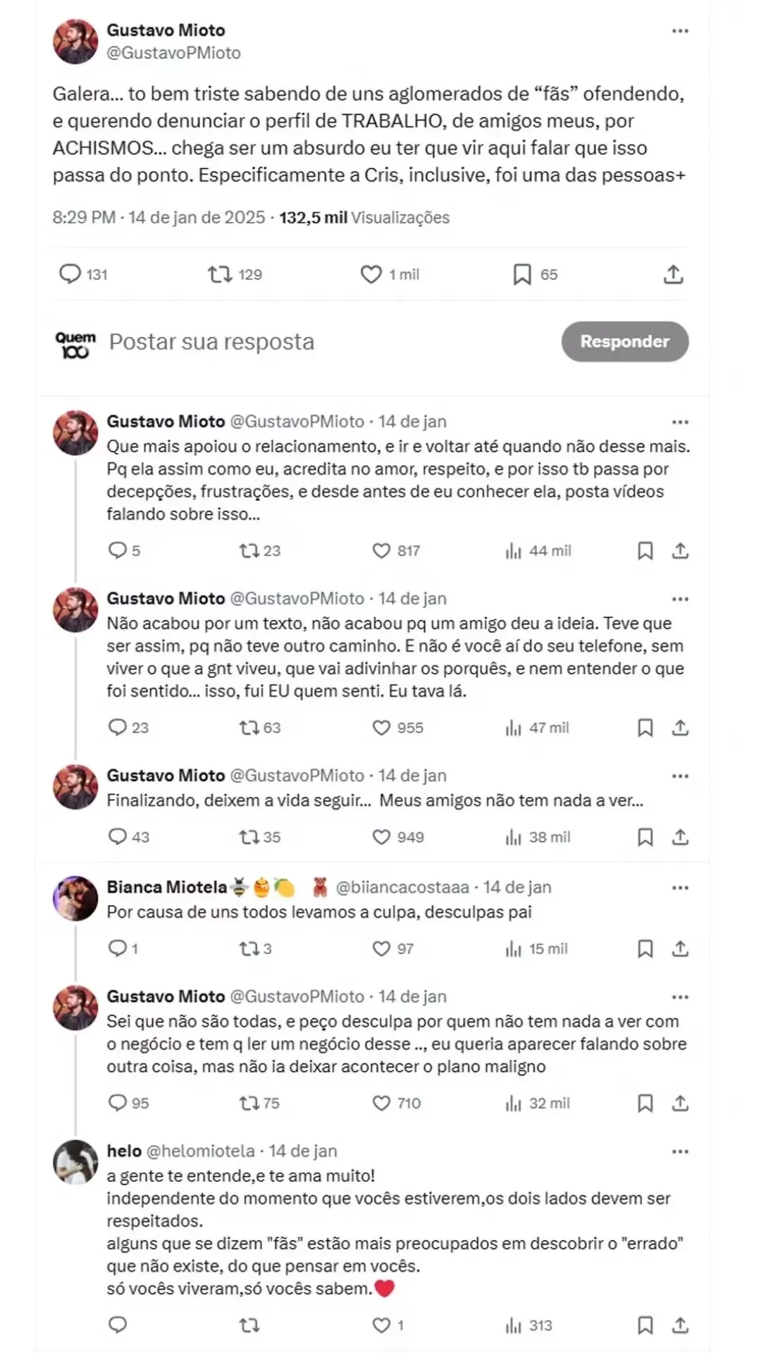 "Galera, estou bem triste sabendo de uns aglomerados de 'fãs' ofendendo, e querendo denunciar o perfil de trabalho, de amigos meus, por achismos… chega a ser um absurdo eu ter que vir aqui falar que isso passa do ponto. Especificamente a Cris, inclusive, foi uma das pessoas que mais apoiou o relacionamento, e ir e voltar até quando não desse mais", iniciou Mioto.