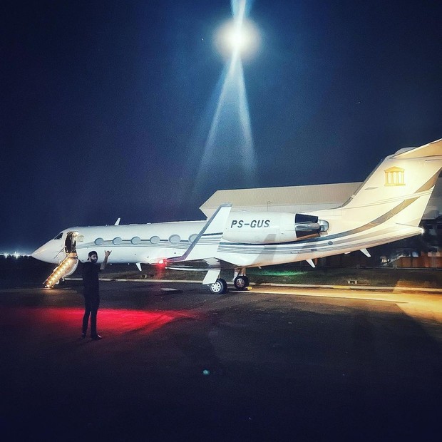 Gusttavo posou sentado na poltrona do jatinho, sozinho, e contou que estava indo de Goiânia para Miami, após passar o fim de semana curtindo o iate para celebrar o aniversário de 3 anos do caçula, Samuel, de seu casamento com Andressa Suita -- eles ainda são pais de Gabriel, de 4 anos.
