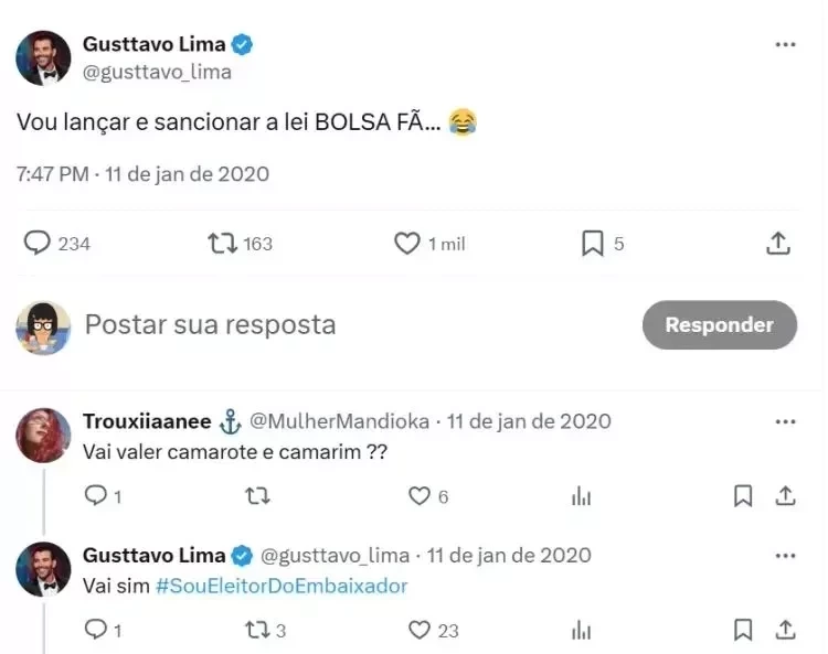 Essa não foi a única “proposta” feita pelo cantor. Em janeiro de 2020, ele publicou no Twitter a ideia de criar um “Bolsa Fã”. Na ocasião, explicou os benefícios da iniciativa ao interagir com seguidores: uma fã perguntou se o benefício incluiria acesso ao camarote e ao camarim dos shows, e ele respondeu afirmativamente, acompanhado da hashtag “sou eleitor do embaixador”.