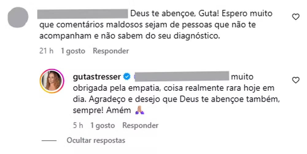 Apesar das críticas, a artista também recebeu apoio. “Deus te abençoe, Guta! Espero muito que comentários maldosos sejam de pessoas que não te acompanham e não sabem do seu diagnóstico”, escreveu uma fã. A atriz agradeceu: “Muito obrigada pela empatia, coisa realmente rara hoje em dia. Agradeço e desejo que Deus te abençoe também, sempre! Amém”.