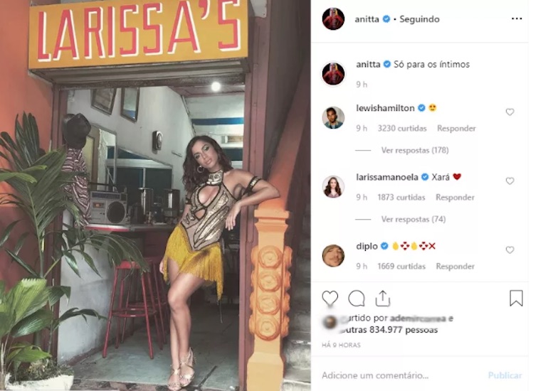 Mas um comentário em especial chamou a atenção: o de Lewis Hamilton, com quem a cantora já viveu um romance, segundo consta na biografia Furacão Anitta. O piloto publicou um emoji "apaixonado" e deixou os fãs agitados.