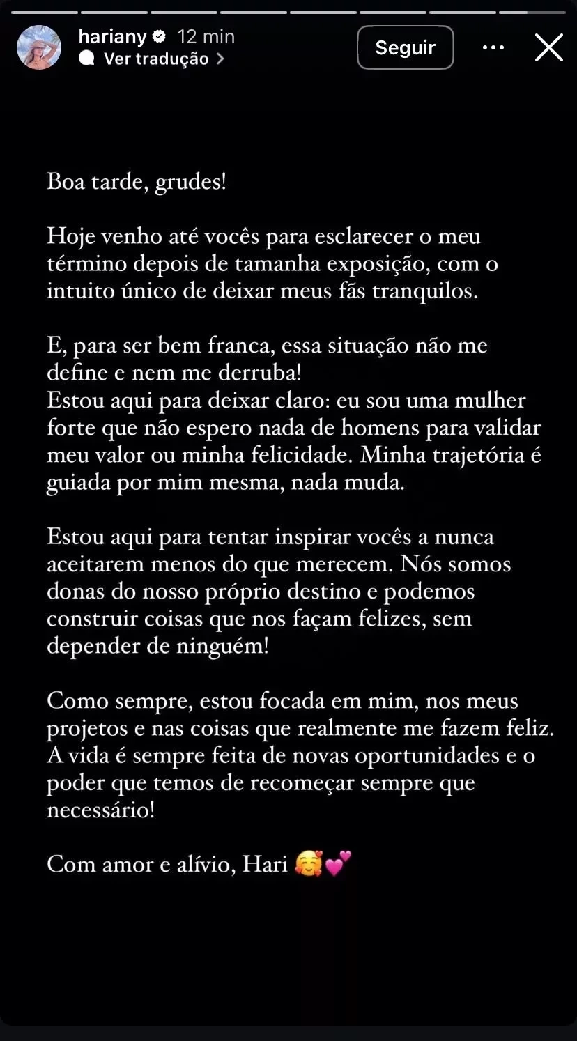 ''Hoje venho até vocês para esclarecer o meu término depois de tamanha exposição, com o intuito de deixar meus fãs tranquilos. E, para ser bem franca, essa situação não me define e nem me derruba. Estou aqui para deixar claro: eu sou uma mulher forte que não espero nada de homens para validar meu valor ou minha felicidade. Minha trajetória é guiada por mim mesma, nada muda’’, iniciou.