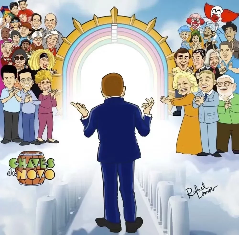 Um desenho retratando Silvio Santos chegando ao céu e sendo recepcionado por outras personalidades famosas viralizou na internet na tarde deste sábado (17). O chargista Rafael Lemos criou uma arte que inclui figuras como Hebe Camargo (1929-2012), Jô Soares (1938-2022), Gugu Liberato (1959-2019), Dercy Gonçalves (1907-2008), entre outros artistas que marcaram a vida do apresentador, reunidos em um portal.