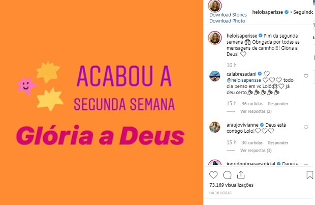"Fim da segunda semana. Obrigada por todas as mensagens de carinho!!!! Glória a Deus!", escreveu ela, que ganhou apoio de amigos como Viviane Araújo, Ingrid Guimarães e Dani Calabresa: "Todo dia penso em você. Já deu certo", disse Dani.