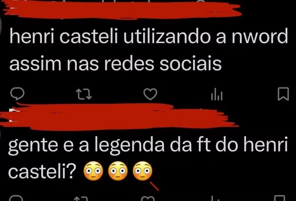 E não parou por aí, outro comentou no X (antigo Twitter), acompanhado com emojis de choque. “Henri Castelli utilizando a n-word assim nas redes sociais”, indagou.