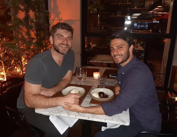 Hugo Bonemer fez uma homenagem para comemorar o aniversário do namorado, Conrado Helt. O ator compartilhou um clique do casal em jantar romântico.