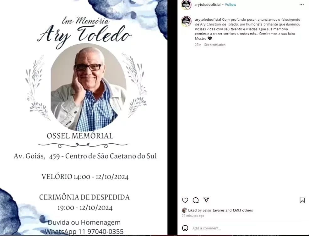 “Com profundo pesar, anunciamos o falecimento de Ary Christoni de Toledo, um humorista brilhante que iluminou nossas vidas com seu talento e risadas. Que sua memória continue a trazer sorrisos a todos nós… Sentiremos a sua falta, Mestre”, comunicou a família.