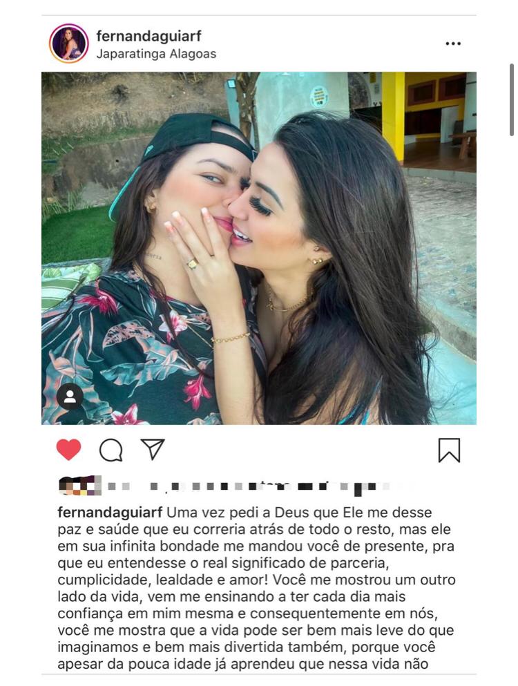 A cantora sertaneja, Maria Clara também postou uma foto ao lado da influencer e na legenda escreveu: "Todas as vezes que pedi a Deus alguém pra viver comigo, pra somar comigo eu sabia que ele iria cumprir, mas me surpreendi no tanto que ele acertou. Eu esperava uma pessoa comum, não uma @fernandaguiarf kkkk oh maria de sorte! Eu também não sabia que ele atenderia tão rápido e que seria tão bom comigo. Você desperta a minha melhor versão, você me ajuda a ser melhor, você soma. Eu achava que não era capaz de amar alguém como eu amo você, eu sei que é raro o que a gente tem e eu achava que não era possível viver isso" declarou.