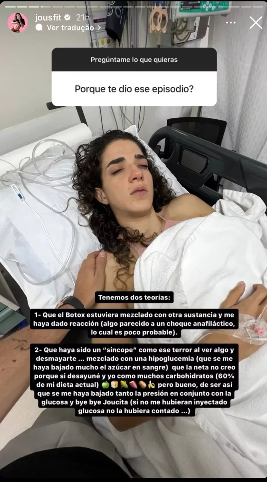Um seguidor questionou a causa da reação, e a musa fitness explicou sua possível origem. "Temos duas teorias. A primeira é que o botox foi misturado com outra substância e me deu uma reação (algo parecido com um choque anafilático, o que é improvável)", esclareceu.