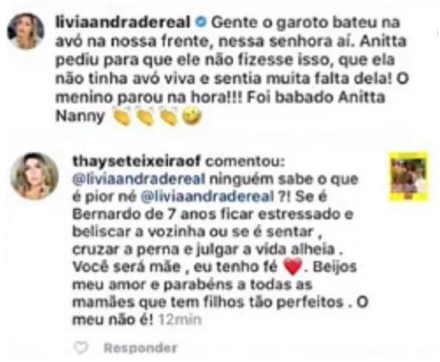 Já Thayse disse: "Ninguém sabe o que é pior, né, Livia Andrade? Se é Bernardo, de 7 anos, ficar estressado e beliscar a vózinha ou se é sentar, cruzar a perna e julgar a vida alheia. Você será mãe, eu tenho fé. Beijos, meu amor, e parabéns para todas as mães que tem filhos perfeitos. O meu não é".