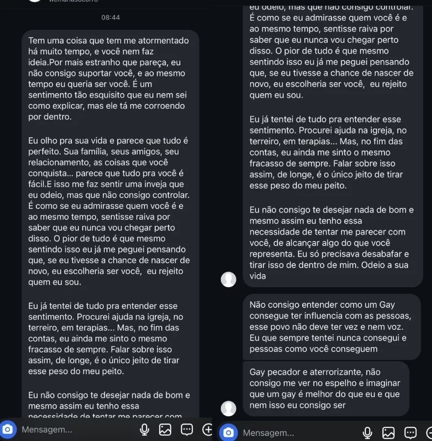 No texto enviado a Brenno, o autor confessa uma mistura de admiração e raiva: "Eu olho pra sua vida e parece que tudo é perfeito. Sua família, seus amigos, seu relacionamento... parece que tudo pra você é fácil. [...] Eu já me peguei pensando que, se eu tivesse a chance de nascer de novo, eu escolheria ser você." No entanto, a mensagem também carrega um tom de preconceito explícito: "Não consigo entender como um gay consegue ter influência com as pessoas. Esse povo não deve ter vez e nem voz."