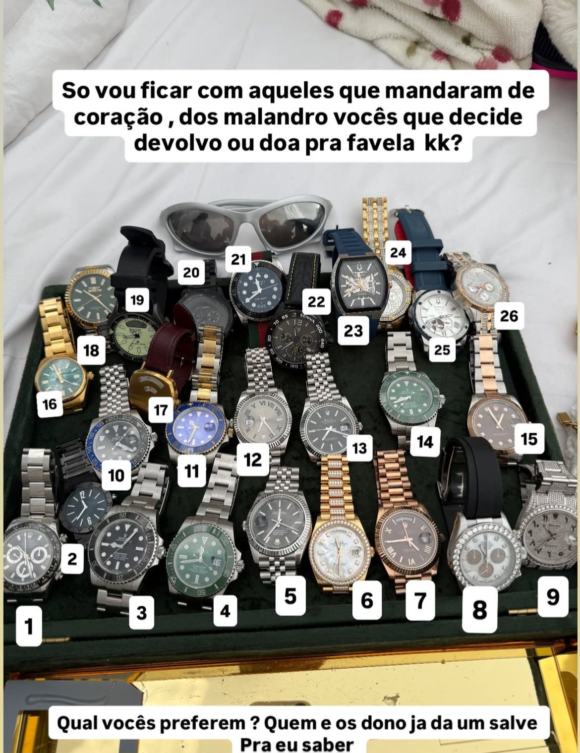 “As correntes e os relógios, os que for de coração, eu vou guardar pra mim em forma de recordação. Os que não for, mano, que deram com outras intenções… ou eu vou devolver, ou eu vou distribuir na favela, tô analisando”, declarou o influenciador.