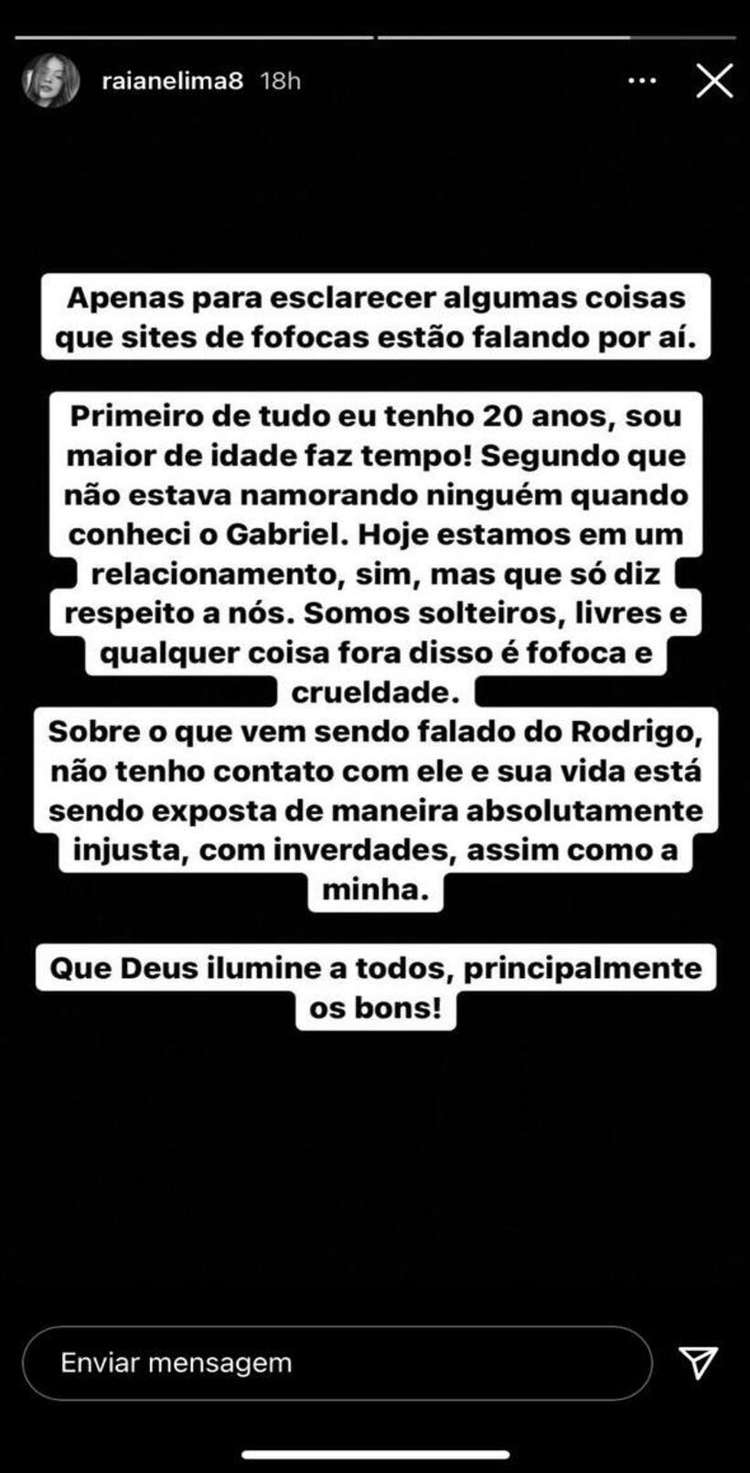 Raiane e o político se envolveram quando ele ainda era casado com a médica Marina Cantarelli, com quem teve dois filhos. Segundo a publicação, agora que Rodrigo estava separado e planejando assumir o relacionamento com a jovem, ela escolheu ficar com o atacante da Seleção Brasileira.