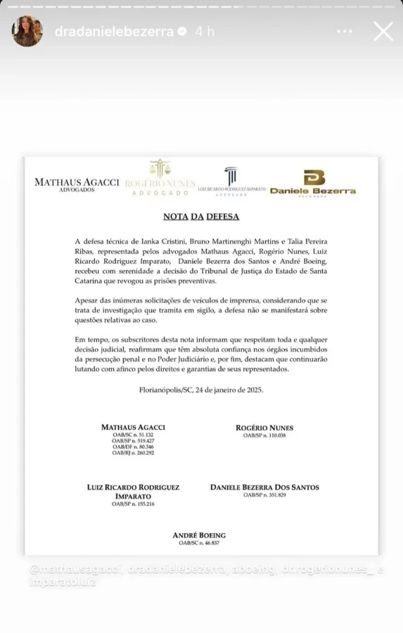 A defesa dos envolvidos se pronunciou através de uma nota publicada nas redes sociais. Entre os advogados está a irmã de Deolane Bezerra. "A defesa técnica de Ianka Cristini, Bruno Martinenghi Martins e Talia Pereira Ribas, representada pelos advogados Mathaus Agacci, Rogério Nunes, Luiz Ricardo Rodriguez Imparato, Daniele Bezerra dos Santos e André Boeing, recebeu com serenidade a decisão do Tribunal de Justiça do Estado de Santa Catarina que revogou as prisões preventivas", informou.
