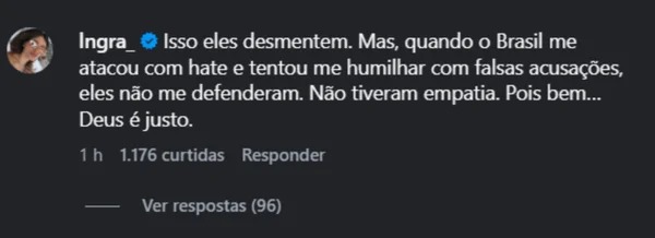 “Isso eles desmentem. Mas, quando o Brasil me atacou com hate e tentou me humilhar com falsas acusações, eles não me defenderam. Não tiveram empatia. Pois bem… Deus é justo”, escreveu em uma publicação no Instagram.