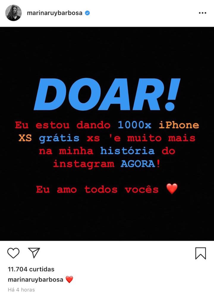 Na madrugada desta terça-feira (16), os fãs de Marina Ruy Barbosa se assustaram com publicações estranhas realizadas em sua conta de Instagram. O perfil da atriz, que conta atualmente com 33,3 milhões de seguidores, havia divulgado peças de promoções indicando que ela doaria smartphones e notebooks mediante a cliques em links disponibilizados em seus stories. As informações são da Uol.
