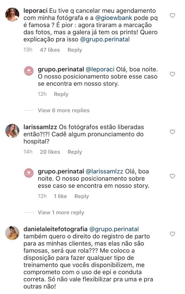 Internautas se manifestaram na última publicação feita pelo Grupo Perinatal na rede social. "Direitos iguais para todas as mães! Exceção pra uma famosa, que chacota né?", disse uma seguidora. "Absurdo! Eu liguei dias antes do meu parto, para me certificar se já estava liberado e a reposta que tive foi: Não, devido a pandemia! Expliquei que seria minha irmã fotógrafa, que mora comigo, iria fazer as fotos e mesmo assim não liberaram. Meu marido, o acompanhente, que teve fazer as fotos no calor da emoção. E agora isso? Desrespeito!", indignou-se outra.