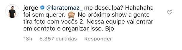 No fim da noite, Jorge se manifestou sobre o incidente e pediu desculpas a jovem. “Foi sem querer. No próximo show a gente tira foto com vocês 2. Nossa equipe vai entrar em contato e organizar isso. Beijo”, prometeu o cantor.