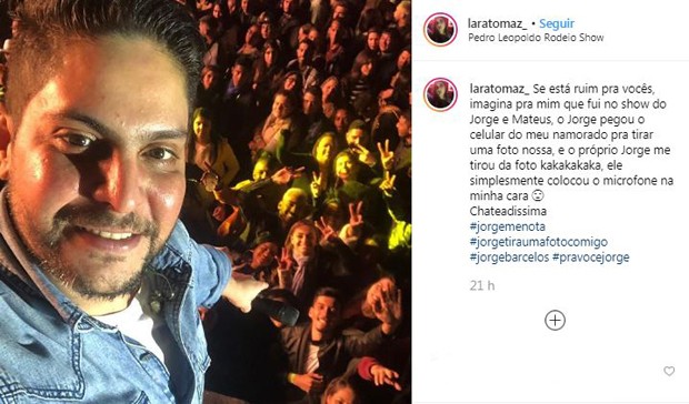 Jorge, da dupla com Mateus, se envolveu em mais uma situação inusitada na noite da última quarta-feira (19). O cantor viralizou na web após tirar uma selfie com os fãs. A internauta Lara Tomaz, que esteve, ontem, no show da dupla sertaneja, revelou que tentou tirar uma foto com o cantor, mas que deu errado por causa do artista. As informações são do Jetss.