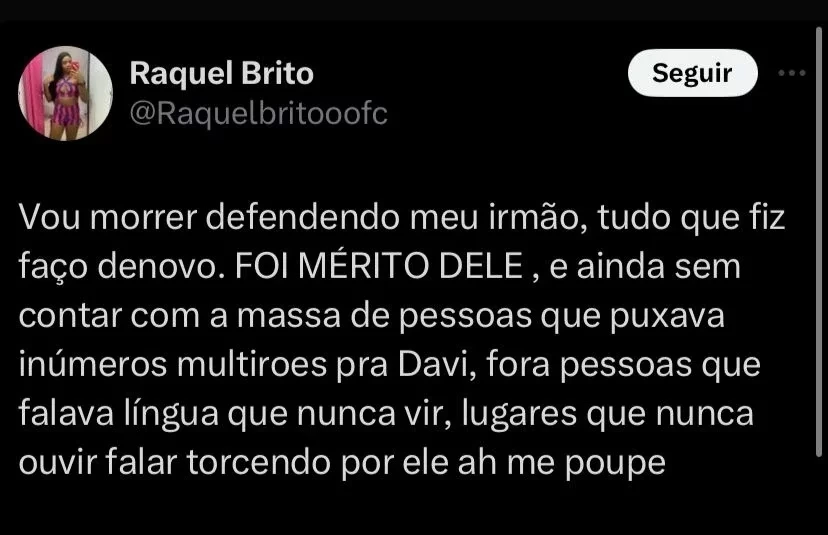 Ela aproveitou para relembrar o sucesso que o baiano teve dentro da casa e ressaltou que tudo foi mérito dele. “Vou morrer defendendo meu irmão, tudo que fiz faço de novo. FOI MÉRITO DELE, e ainda sem contar com a massa de pessoas que puxava inúmeros mutirões pra Davi, fora pessoas que falavam língua que nunca ouvi, lugares que nunca ouvi falar torcendo por ele ah me poupe”.