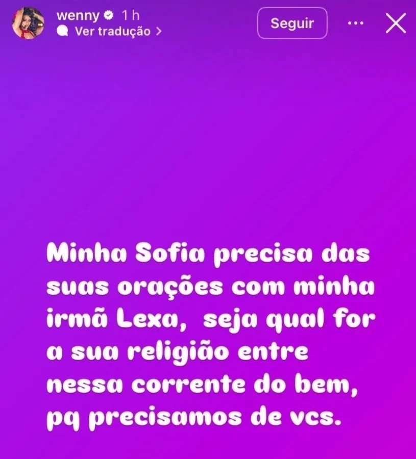 "Minha Sofia precisa das suas orações com minha irmã Lexa, seja qual for a sua religião, entre nessa corrente do bem, porque precisamos de vocês", escreveu Wenny nos Stories do Instagram.