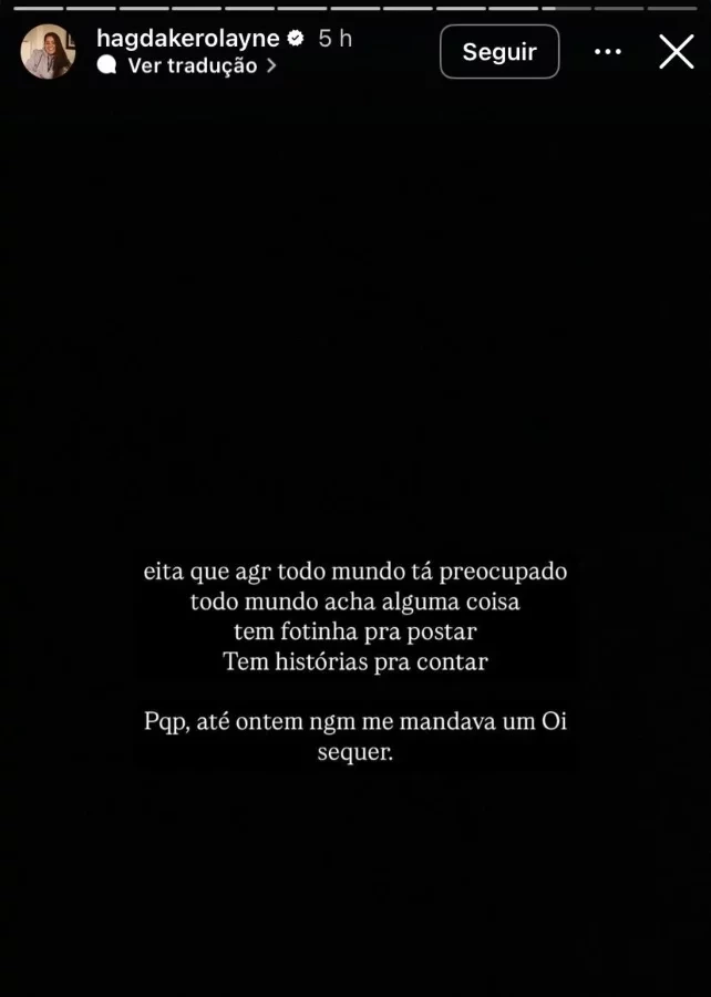“Eita que agora todo mundo tá preocupado, todo mundo acha alguma coisa, tem fotinha pra postar, tem histórias pra contar. Pqp, até ontem ninguém me mandava um oi sequer”, escreveu ela nos stories.