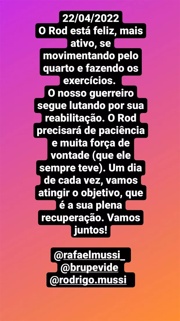 "Rodrigo está feliz, mais ativo, se movimentando pelo quarto e fazendo os exercícios. O nosso guerreiro segue lutando por sua reabilitação. O Rod precisará de paciência e muita força de vontade (que ele sempre teve). Um dia de cada vez vamos atingir o objetivo, que é a sua plena recuperação. Vamos juntos!", afirmou o advogado.