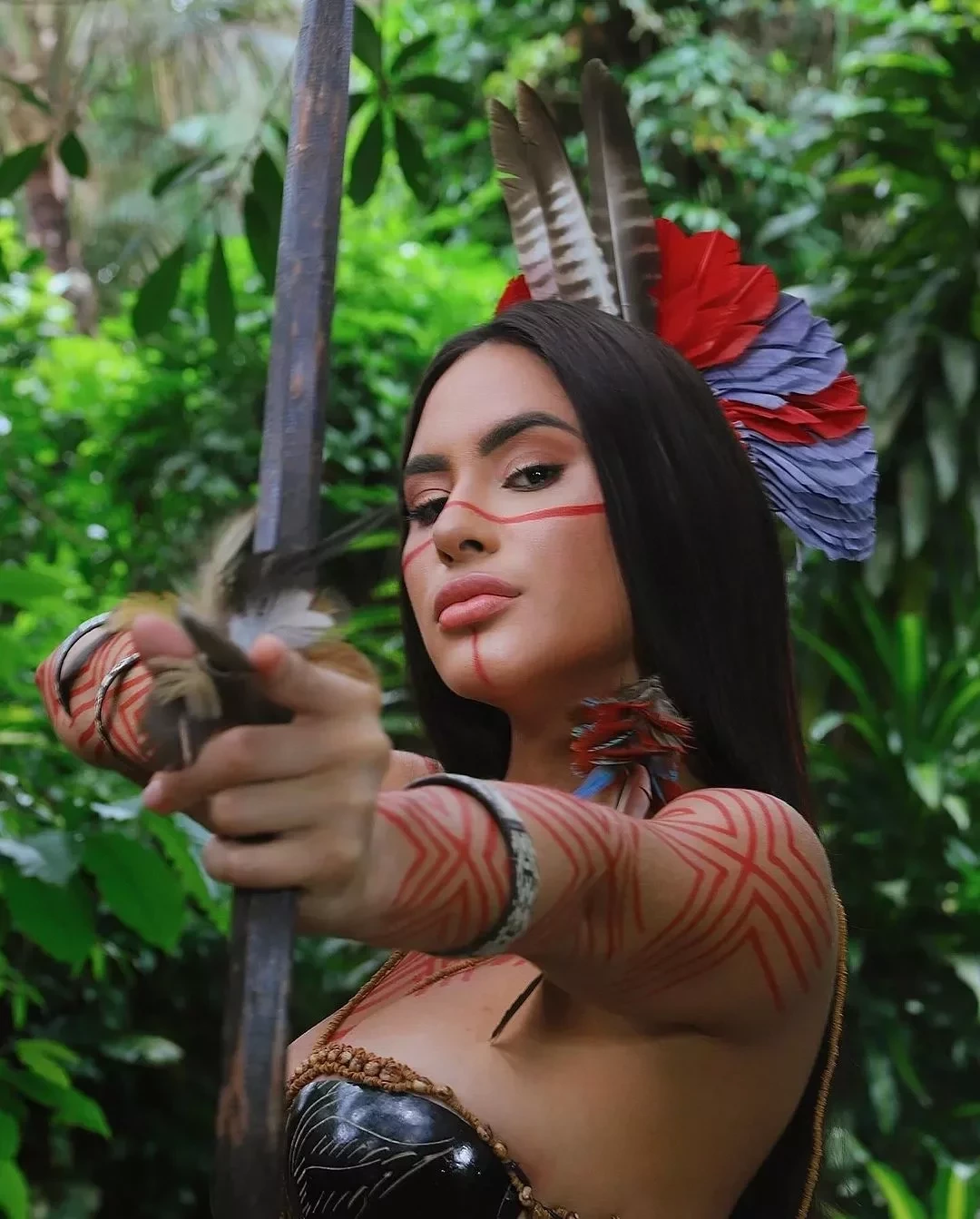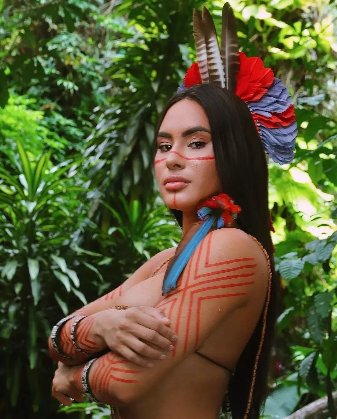 Isabelle Nogueira compartilhou neste sábado (1º) uma sequência de fotos com a temática indígena. A ex-BBB, que é cunhã-poranga do Boi Garantido, posou em meio à flora e com pinturas indígenas pelo corpo, além de seu tradicional cocar.