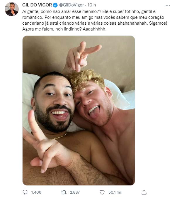 SÃO PAULO, SP (FOLHAPRESS) - O economista Gil do Vigor, 30, deixou seus fãs e seguidores intrigados ao publicar uma foto em seu Twitter ao lado de um "por enquanto amigo". O ex-BBB compartilhou o registro onde está deitado sem camisa junto com um homem loiro, sem explicar quem seria.