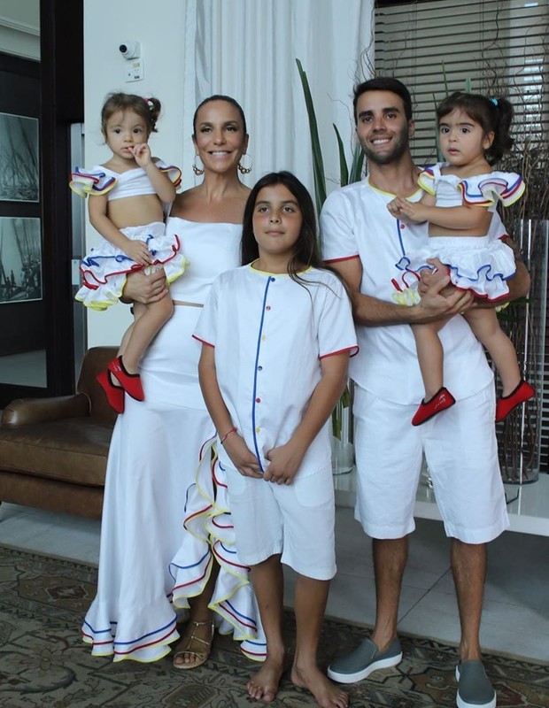 Ivete Sangalo compartilhou em seu Instagram um clique do aniversário de dois anos das gêmeas, Marina e Helena. O marido da cantora, Daniel Cady, e o primogênito, Marcelo, entraram no clima da festa e se vestiram com looks similares, que remetiam ao frevo.