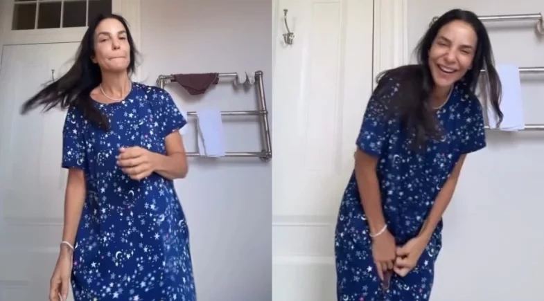 Enquanto dançava no banheiro, a cantora notou que havia deixado uma calcinha pendurada no suporte do ambiente. Ao perceber a situação, ela caiu na risada e retirou a peça do local de forma descontraída.