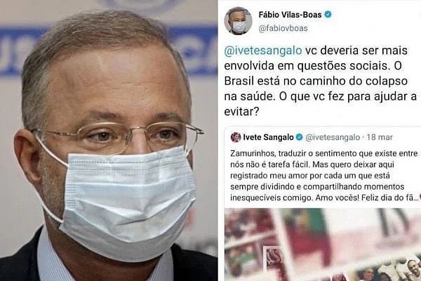 "Você deveria ser mais env/olvida em questões sociais. O Brasil está no caminho do colapso na saúde. O que você fez para ajudar a evitar?", questionou Vilas-Boas em algumas mensagens das mensagens, citando também Daniela Mercury, Cláudia Leitte, Neymar e Luciano Huck.