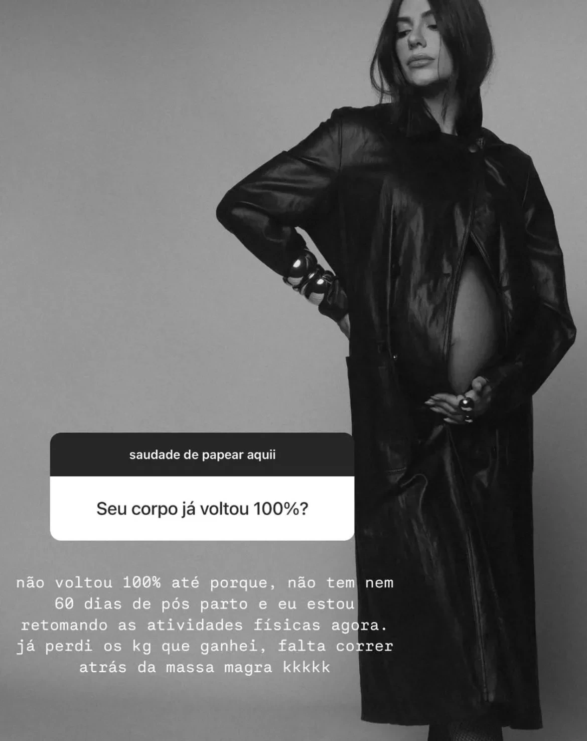 "Não voltou 100% até porque, não tem nem 60 dias de pós parto e eu estou retomando as atividades físicas agora. já perdi os kg que ganhei, falta correr atrás da massa magra", disse.