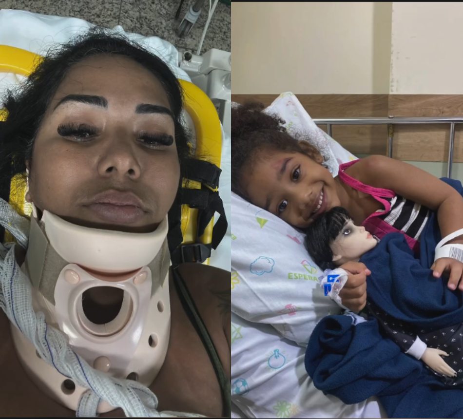 Janielly Nogueira com colar cervical e sua filha de três anos. Foto: Reprodução/Instagram