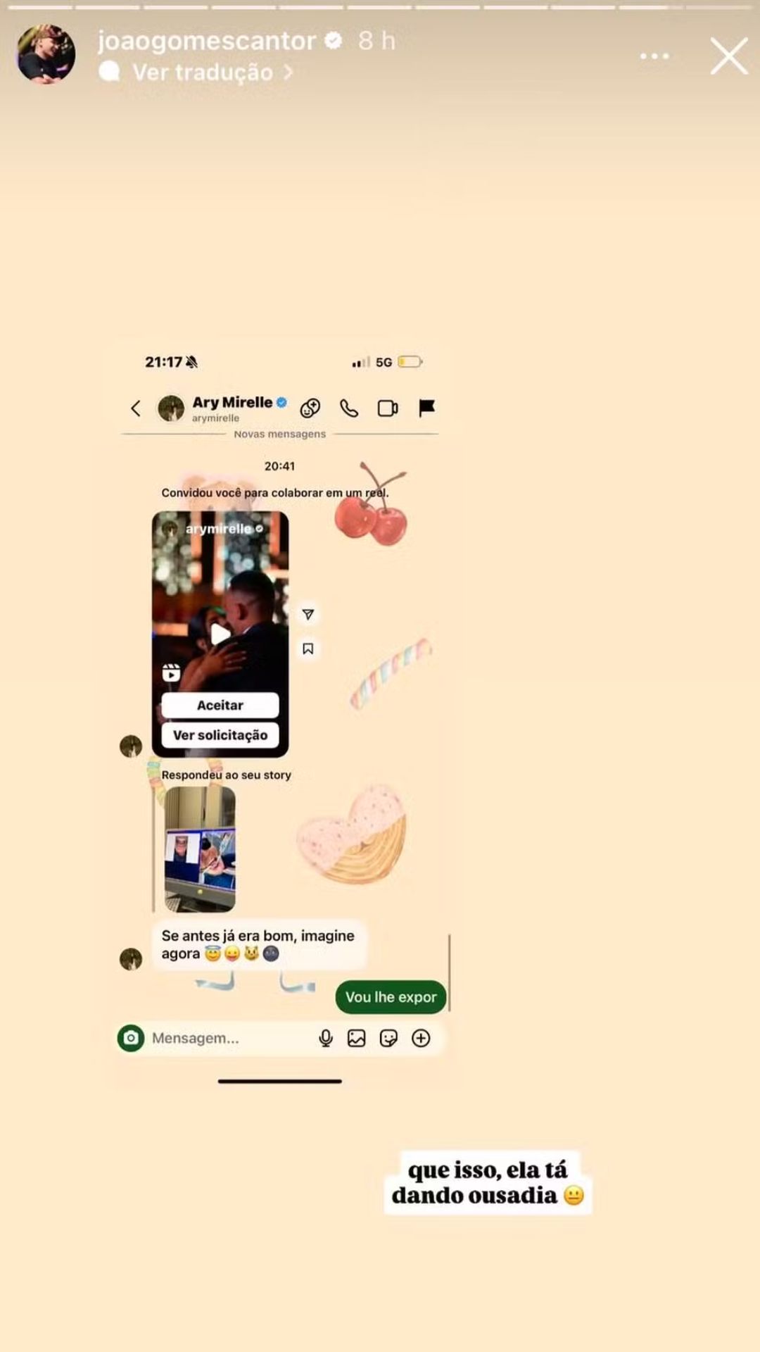 "Se antes já era bom, imagine agora", comentou Ary no direct do cantor, que não deixou a mensagem no privado. "Vou lhe expor", respondeu ele, publicando o print da conversa. Em tom descontraído, João ainda brincou: "Ela tá dando ousadia".
