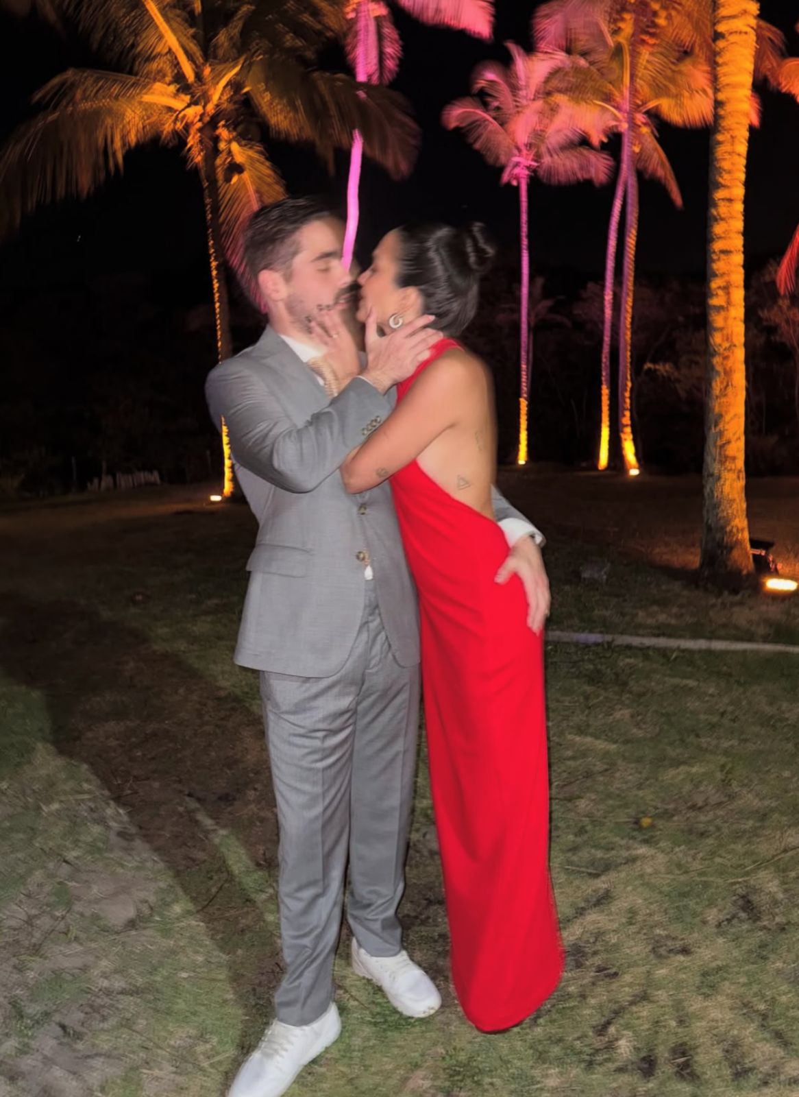 Nas fotos publicadas no Instagram, o apresentador aparece usando um terno cinza e, em clima descontraído, surge apertando o bumbum da amada, que escolheu um vestido vermelho para o evento.